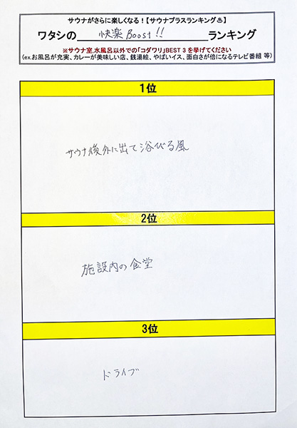 サウナ室の温度・湿度、水風呂の導線などなど、サウナと水風呂以外でこだわっていることをランキング化して発表してもらいます。