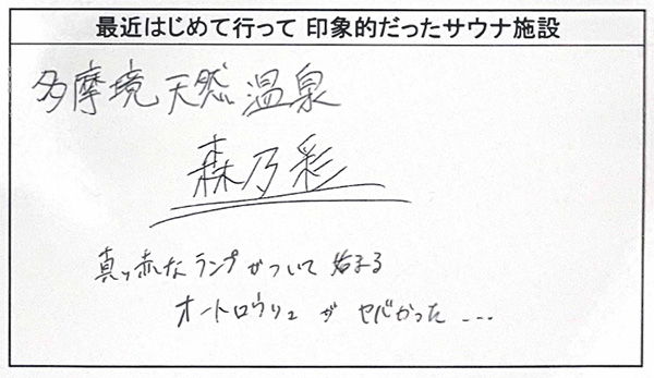 これが初サウナの記憶になったそうですが、次はしっかり水風呂に入るのを目標に、またリフレッシュしに行きたいそうです。