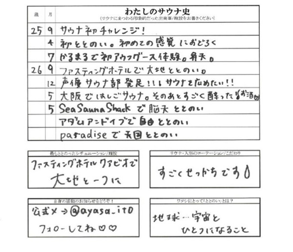初サウナは、声優仲間の佐々木未来さんにサウナの入り方を教えてもらい、そこから3回目ほどのサウナで初ととのいを体験したそうです。