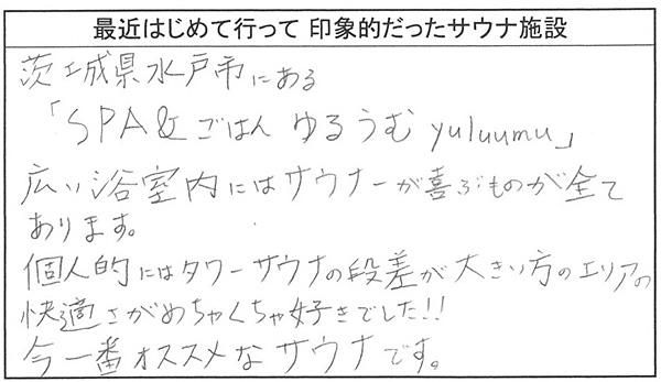 ゆるうむはタワーサウナが大きく、快適感が凄いそうです。