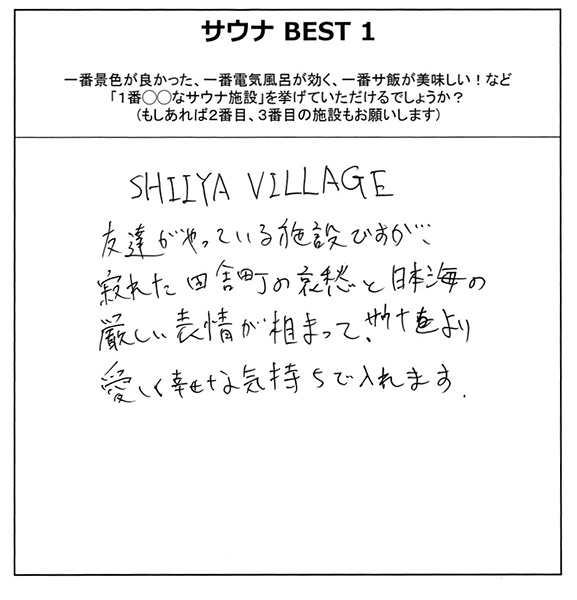 いつか、サウナ好きのミュージシャンを集めて新潟フェスを行い、このSHIIYA VILLAGEにみんなで入りたいそうです。