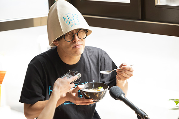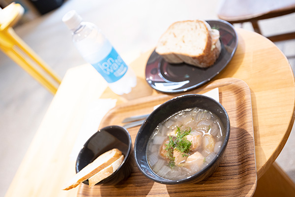 そして田邊さんがサーモンスープを試食。