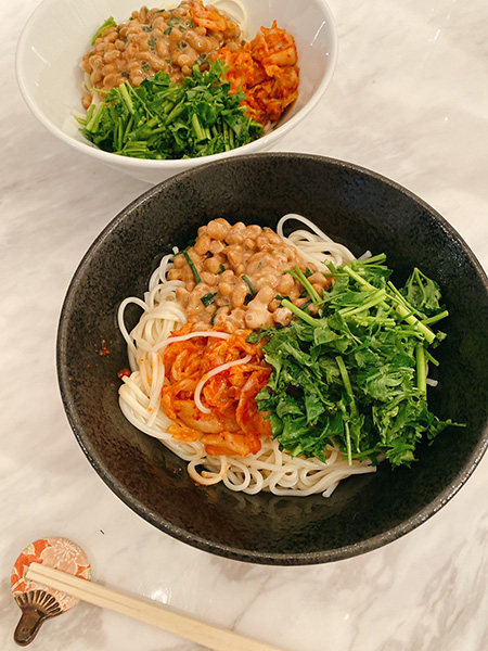 素麺にのっているのは、納豆・キムチ・パクチー! とっても美味しそうです。