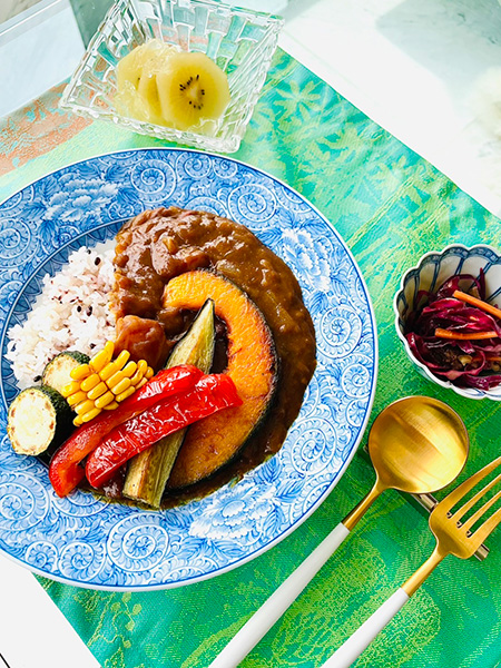 暑い夏にも食が進むトマトカレーに、野菜が取れるよう夏野菜の素揚げをどっさり乗せているそう。