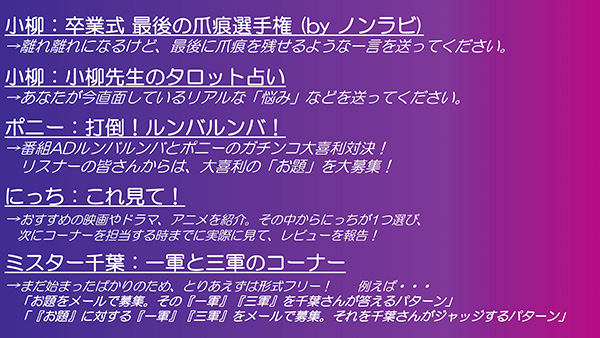 小柳さんからは、「脳使って、送って来い」と我々リスナーの脳に直接語りかけてきましたね。