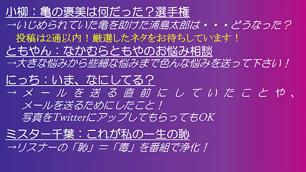 毎回出されるお題に沿ったメッセージ(ネタ)を送ってもらい、その中から1位を決定するこのコーナー。