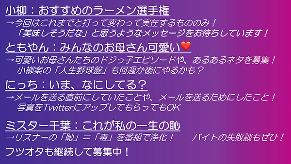 千葉「8月26日はにっちの誕生日でしたが、番組継続の結果が気になりすぎてふっとばしてしまいました。ごめんなさい。今週改めて、お祝いします!」