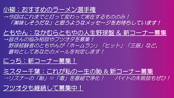 ともやんさん・にっちさん・千葉さんは新コーナーを募集中です。