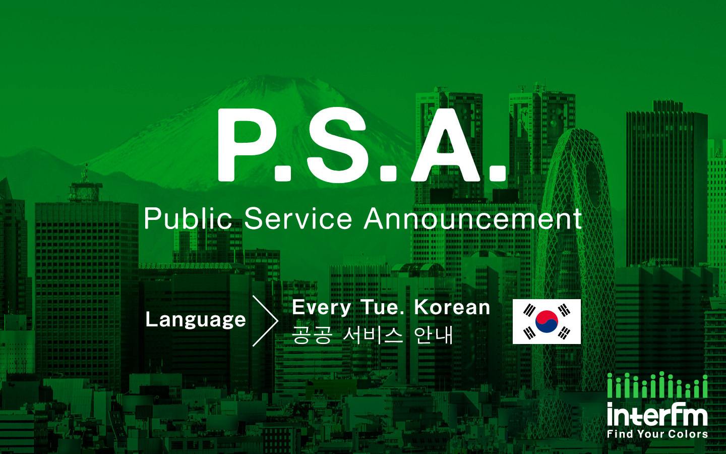 InterFM897が開局以来続けている「P.S.A.」(Public Service Announcement)は、在日外国人に向け、生活情報や災害時の避難場所などの案内を含め、日本での生活に役立つ情報を中心に、各言語でお届けしています。Mon-Fri. 05:00~05:09Mon. - ChineseTue. - KoreanWed. - TagalogThu. - SpanishFri. - Portuguese