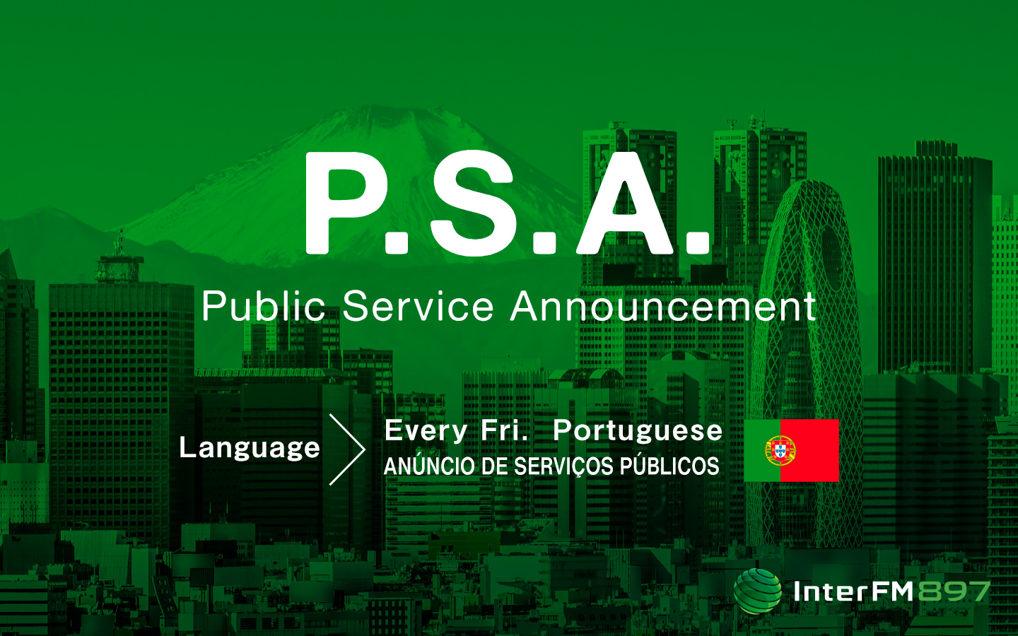 InterFM897が開局以来続けている「P.S.A.」(Public Service Announcement)は、在日外国人に向け、生活情報や災害時の避難場所などの案内を含め、日本での生活に役立つ情報を中心に、各言語でお届けしています。Mon-Fri. 05:00~05:09Mon. - ChineseTue. - KoreanWed. - TagalogThu. - SpanishFri. - Portuguese