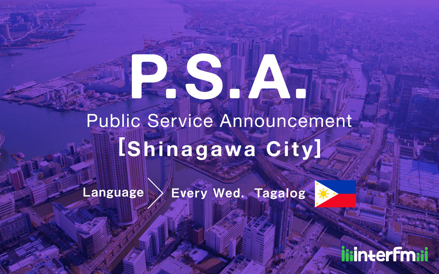 InterFM897が開局以来続けている「P.S.A.」(Public Service Announcement)は、在日外国人に向け、生活情報や災害時の避難場所などの案内を含め、日本での生活に役立つ情報を中心に、各言語でお届けしています。都内で最初に外国人向けに放送を開始したのが品川区です。[言語 - Languages]Mon. - ChineseTue. - KoreanWed. - TagalogThu. & Fri. - English[放送時間 - Schedule]Weekdays - 6:56am